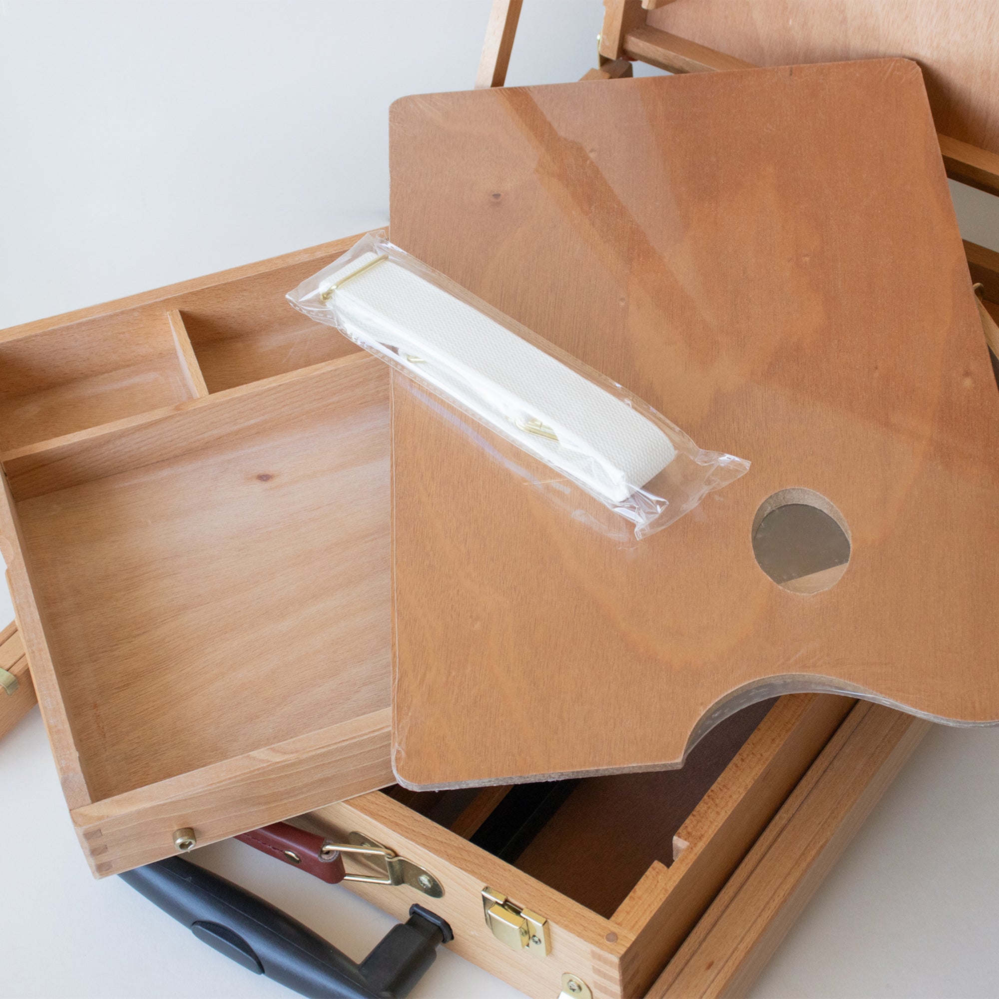 The fold-out legs are adjustable, helpful when working on uneven ground or choose between standing and sitting. Inside the easel, there is a two level compartment for art suply storage. In addition, this easel comes with a rectangular, removable painting palette and an attachable carry strap.