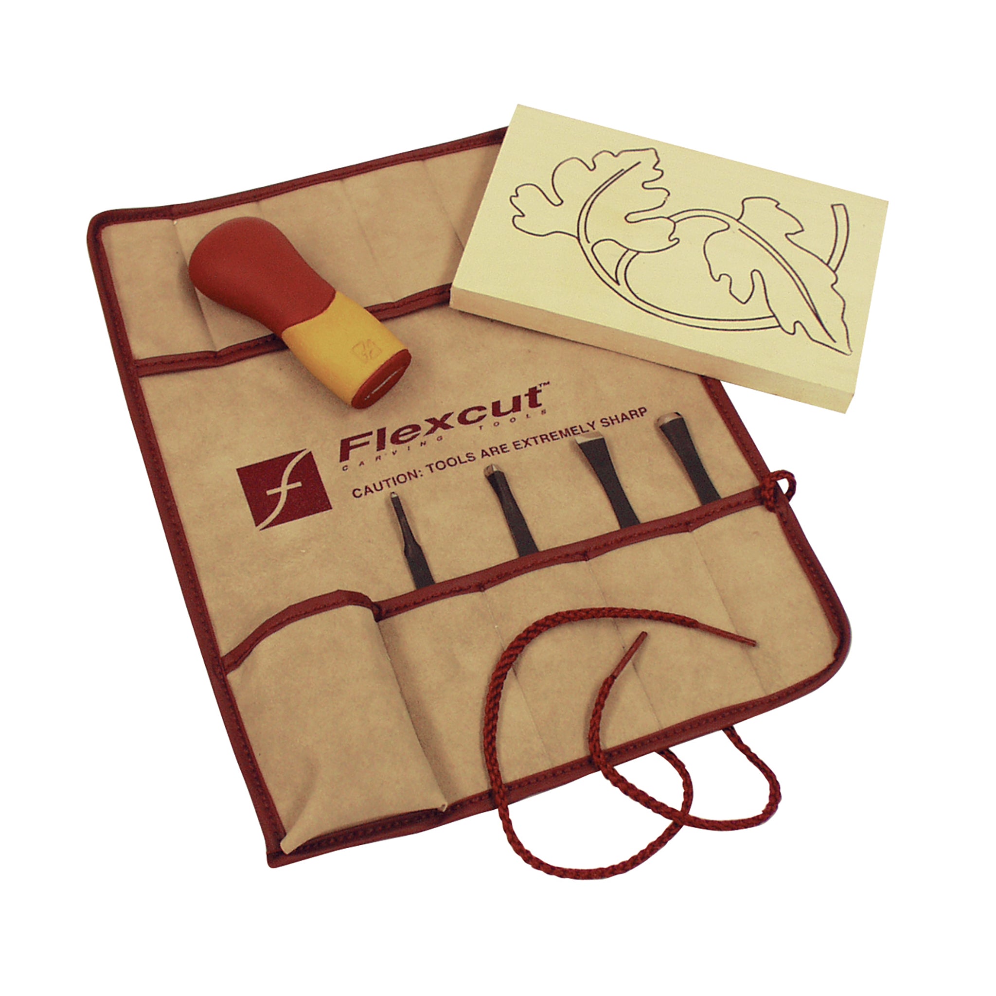 This set comes with four interchangeable carving blades, a quick-connect ABS handle, a leaf project carving blank and an 11-pocket tool roll.