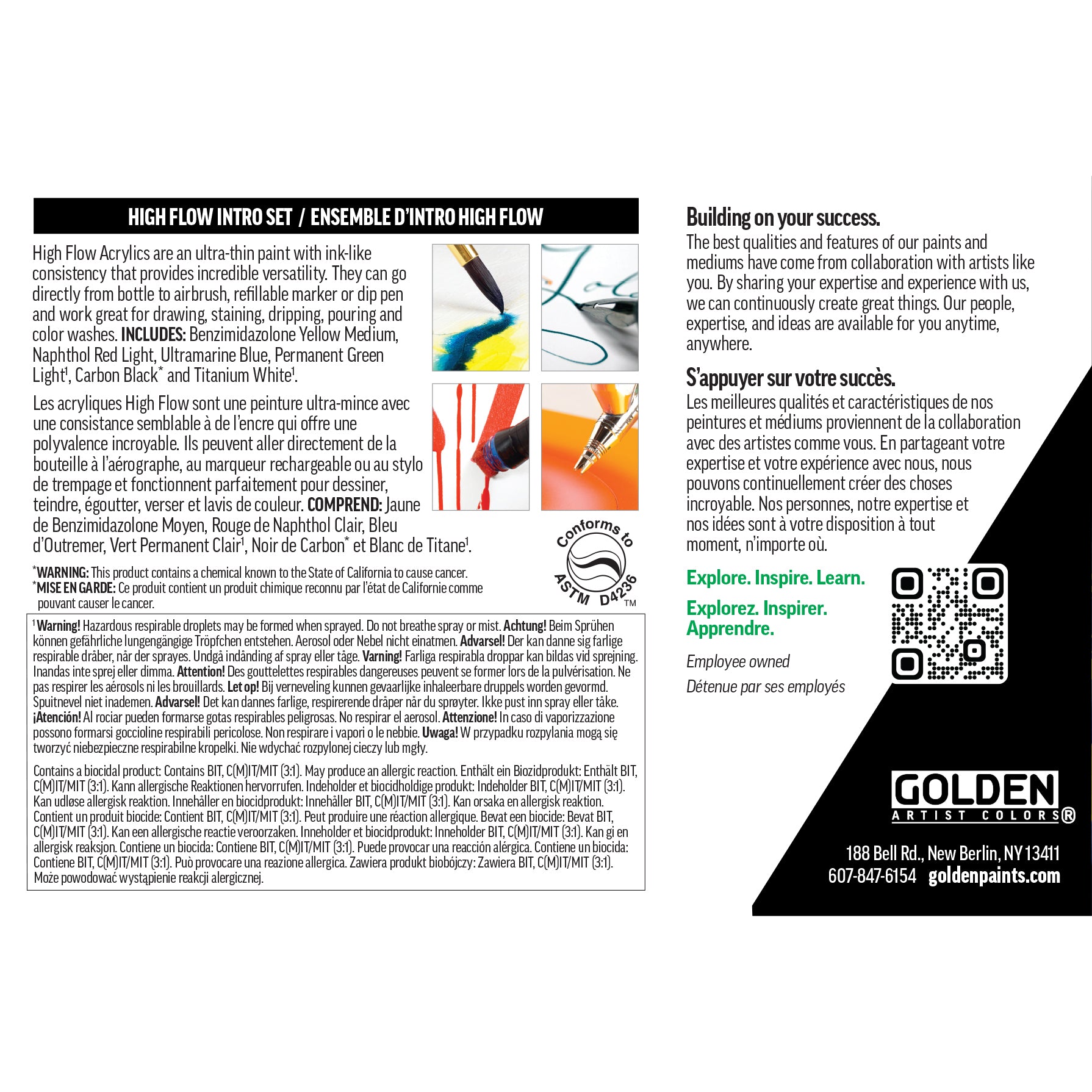 Experience the ink-like consistency and incredible versatility of High Flow Artist Acrylics with this balanced selection of colors.
