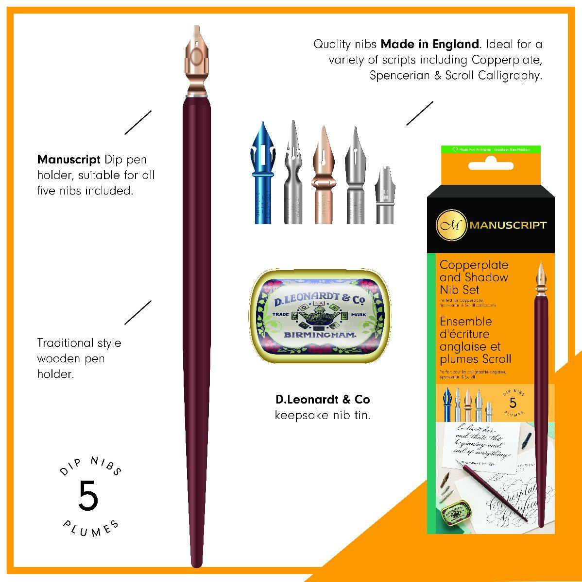 Calligraphy in a traditional style, the Manuscript Copperplate and Shadow Set has been curated to ensure artists have all they need for stylish writing. Featuring five British made calligraphy nibs, this range of Crown, Point, Shorthand, Scroll and Copying nibs will ensure you've everything you need to start your calligraphy.