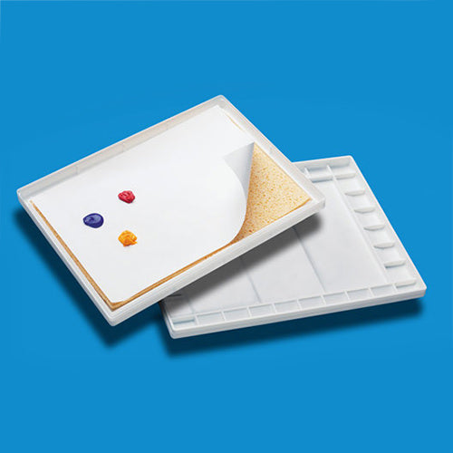 The Sta-Wet Super Pro Palette includes 5 sheets of special acrylic palette paper, a cellulose sponge, a palette tray and lid, and instructions for use.