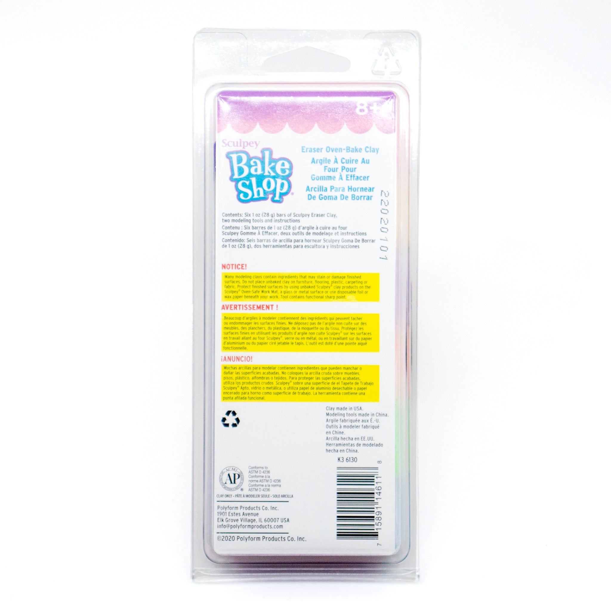 The Sculpey Bake Shop Eraser Clay Set includes six 1 oz bars (Blue, Green, Orange, Pink, Purple, Yellow) & a couple of sculpting tools.