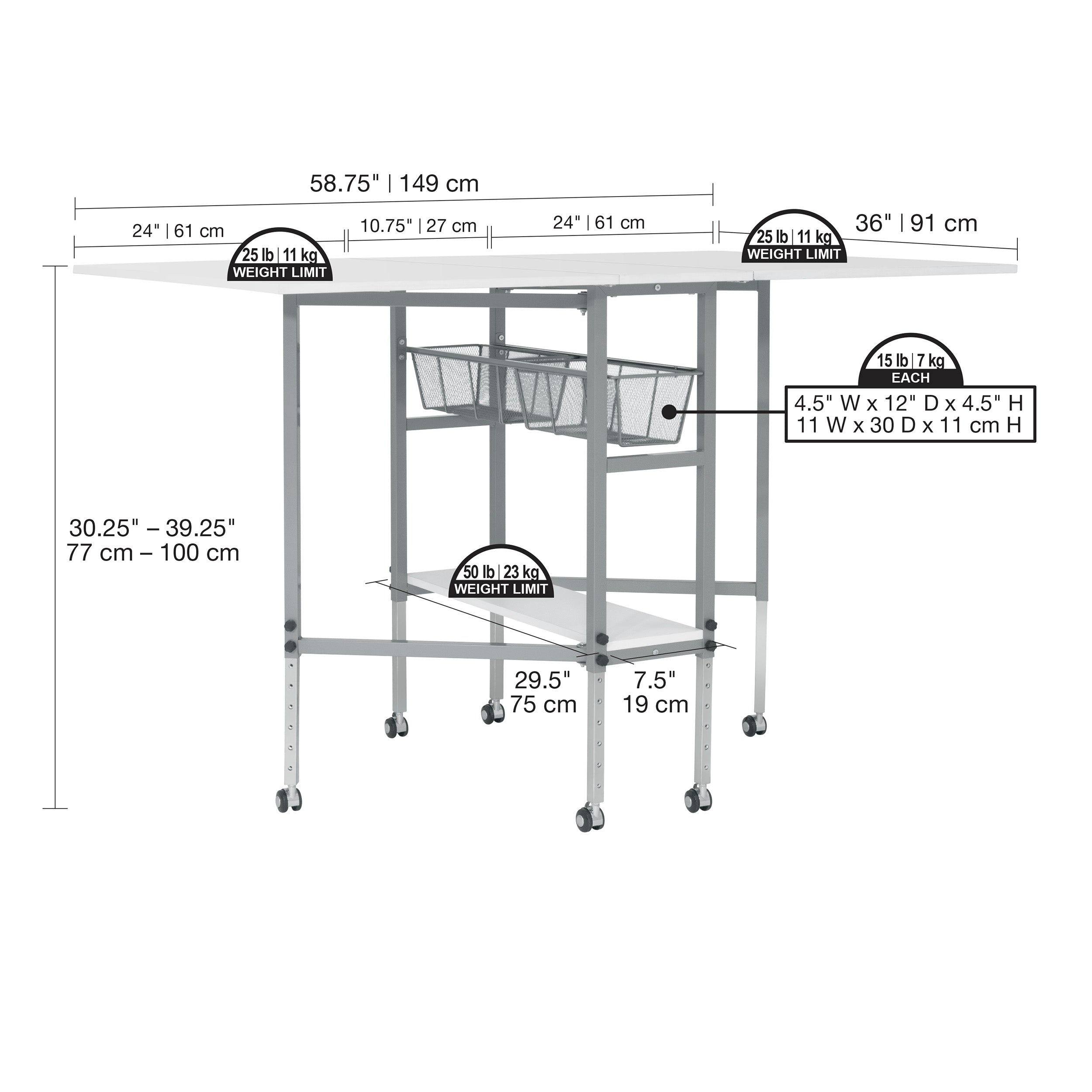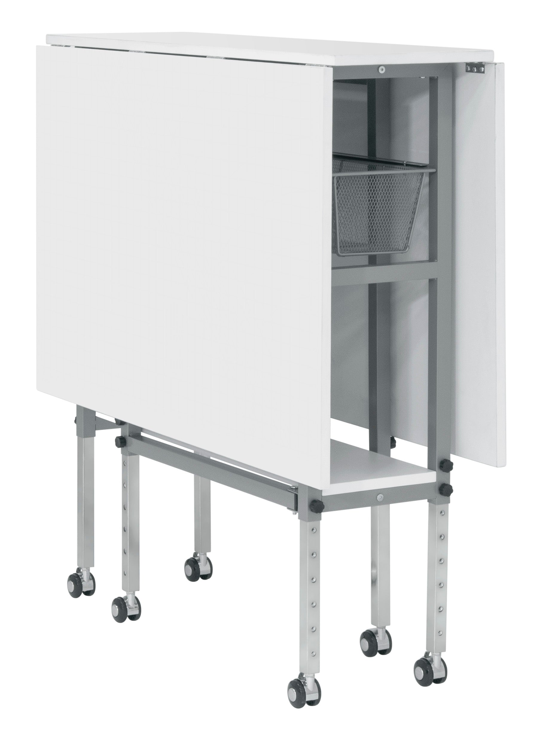 The versatility of the Sew Ready Hobby and Cutting Table by Studio Designs makes it perfect for cutting fabric, crafts or art projects or as an extra workspace. This sturdy table is made from steel and medium-density fibreboard (MDF) and is very easy to assemble. When fully extended it offers a work surface that is 60" X 36" making it ideal to spread-out, cut or adjust fabric and paper. It folds easily and has casters for quick storage when not in use.
