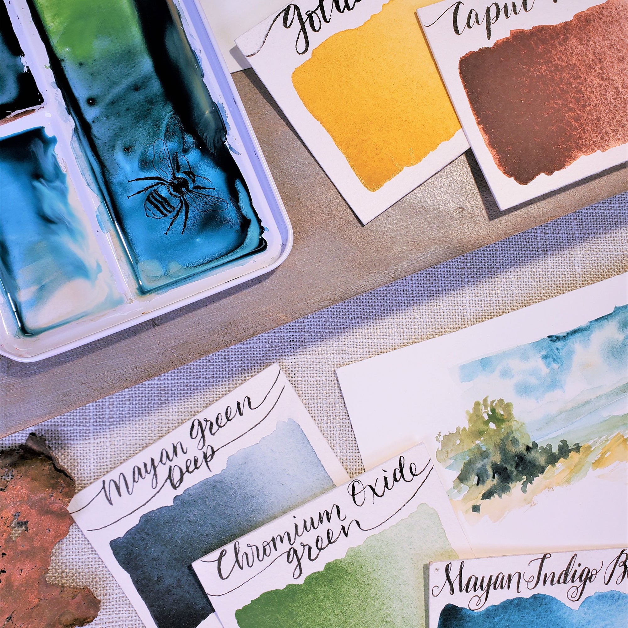 The Earth Palette contains six half pans of our handmade watercolour paint in a hinged metal tin. Measuring approximately 2 1/2” x 2”, this compact size is ideal for travel and plein air painting.