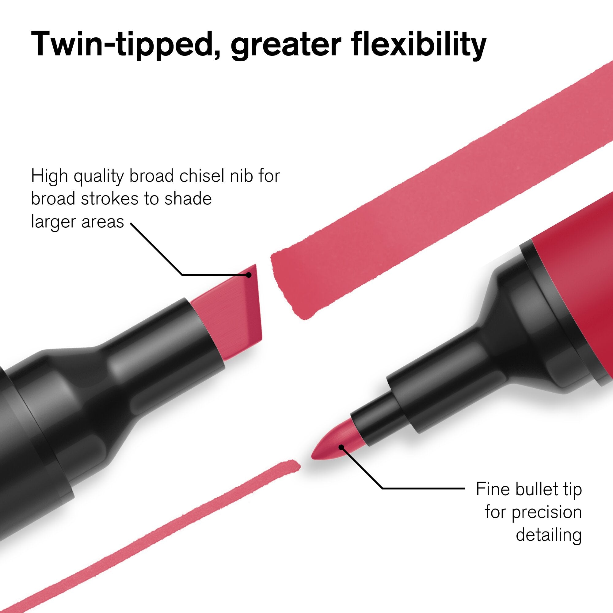 Easily layer and mix different colours without worrying about smudges and blotches. These highly pigmented and vibrant art markers are built to last against fading. All graphic markers have a fine bullet nib for sharp detailed lines and a broad chisel nib for full coverage and multiple line widths.