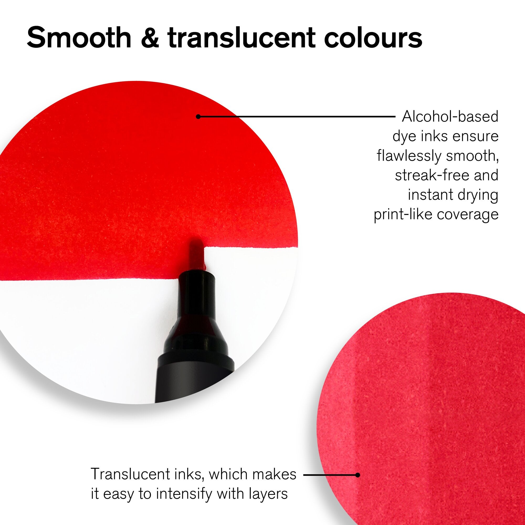 High quality alcohol based inks give incredible tonal range and vibrancy with flawless, streak-free coverage. Promarker colours can be layered or blended and can be used on paper, acetate, glass, wood, or plastic. Perfect for all your drawing, sketching, illustration, and craft needs.