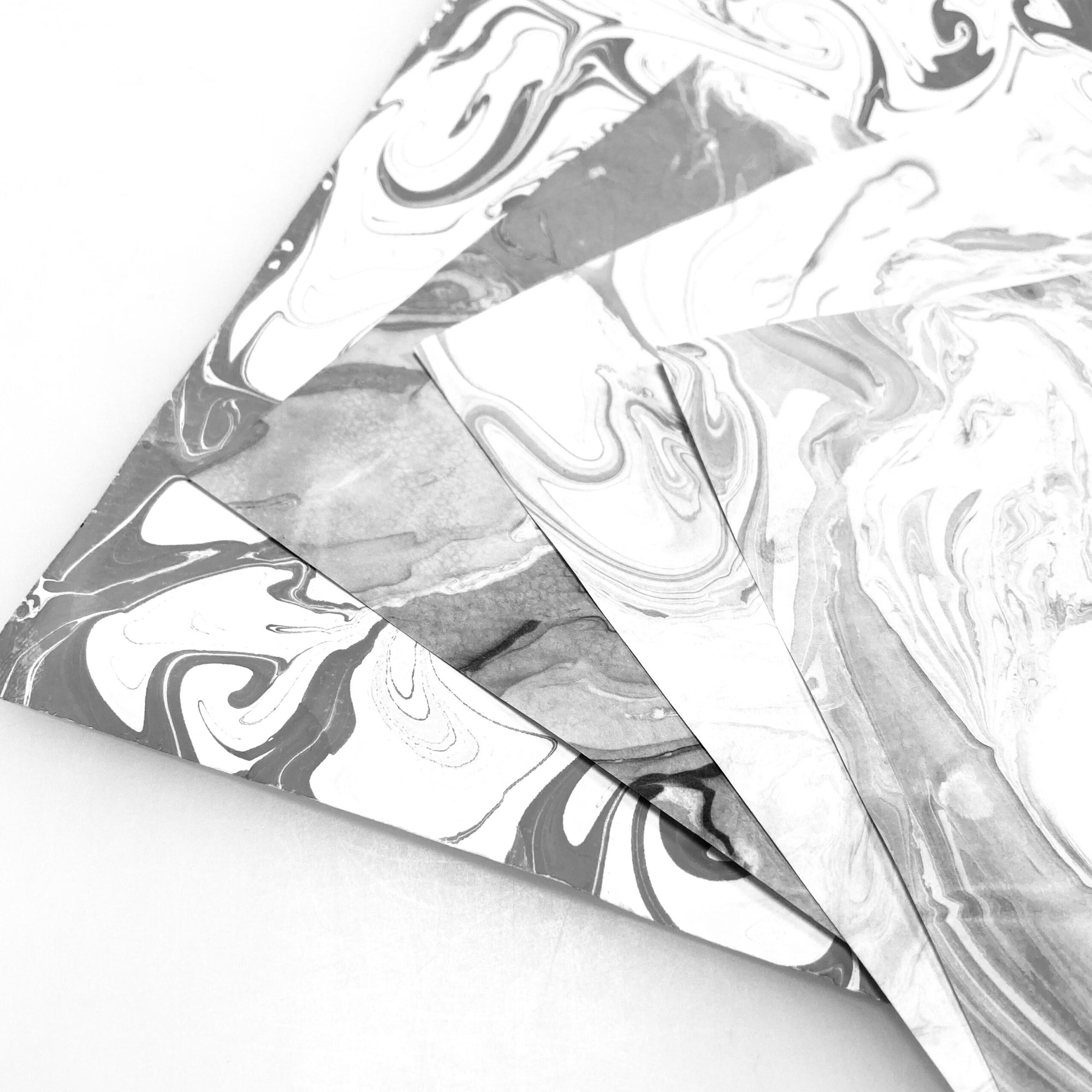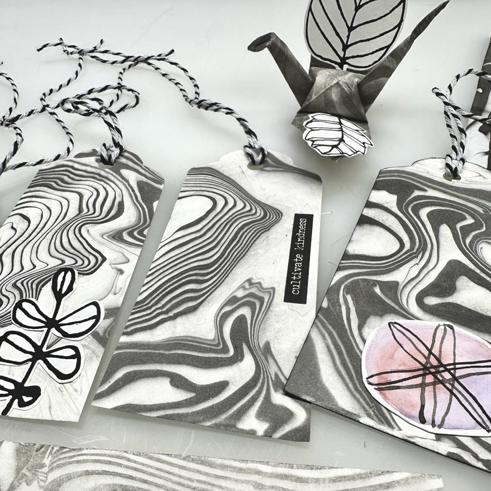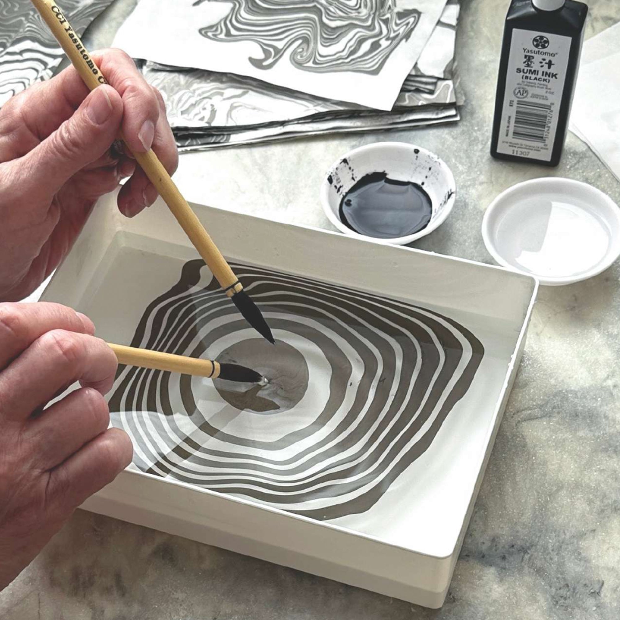 Suminagashi is the Japanese art of water marbling in which liquid sumi ink is dropped onto water to create beautiful marbled patterns, then prints are pulled on washi paper.